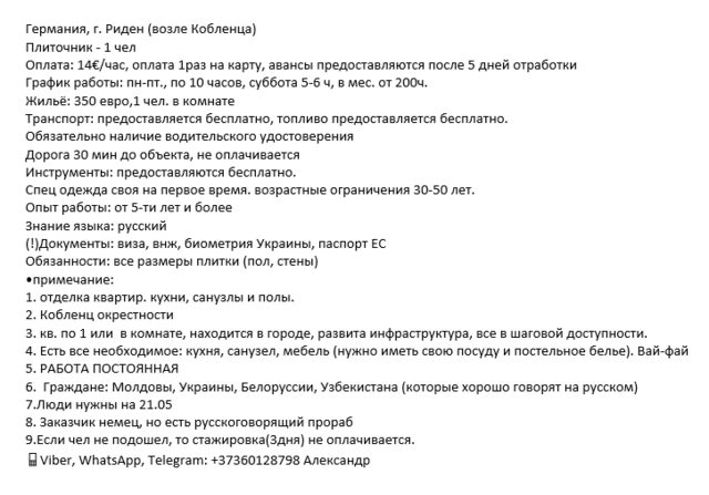 Оплата: 14€/час, оплата 1раз на карту, авансы предоставляются после 5 дней отработки